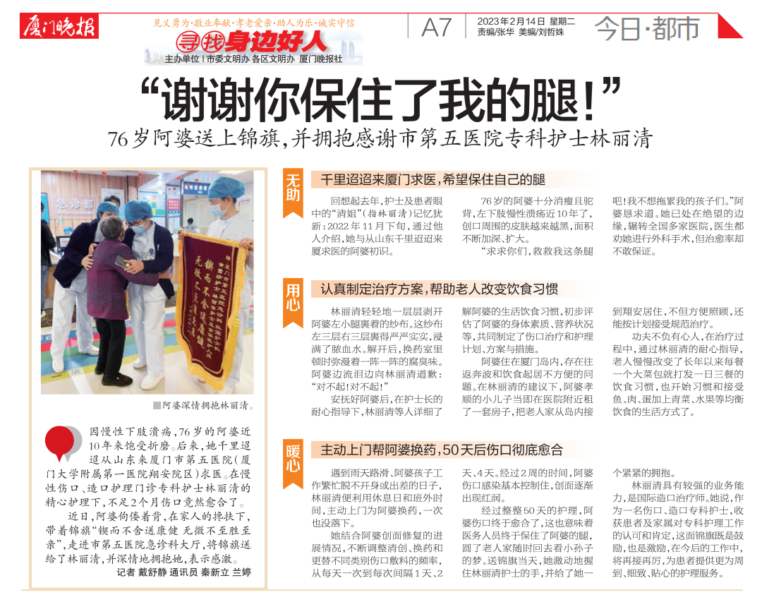 “谢谢你保住了我的腿!”76岁阿婆送上锦旗,并拥抱感谢市第五医院专科护士林丽清2023-2-14 来源:厦门晚报记者 戴舒静通讯员 秦新立 兰婷因慢性下肢溃疡,76岁的阿婆近10年来饱受折磨。后来,她千里迢迢从山东来黑料网 (厦门大学附属第一医院翔安院区)求医。在慢性伤口、造口护理门诊专科护士林丽清的精心护理下,不足2个月伤口竟然愈合了。近日,阿婆佝偻着背,在家人的搀扶下,带着锦旗“锲而不舍送康健 无微不至胜至亲”,走进市第五医院急诊科大厅,将锦旗送给了林丽清,并深情地拥抱她,表示感激。阿婆深情拥抱林丽清无助千里迢迢来厦门求医希望保住自己的腿回想起去年,护士及患者眼中的“清姐”(指林丽清)记忆犹新:2022年11月下旬,通过他人介绍,她与从山东千里迢迢来厦求医的阿婆初识。76岁的阿婆十分消瘦且驼背,左下肢慢性溃疡近10年了,创口周围的皮肤越来越黑,面积不断加深、扩大。“求求你们,救救